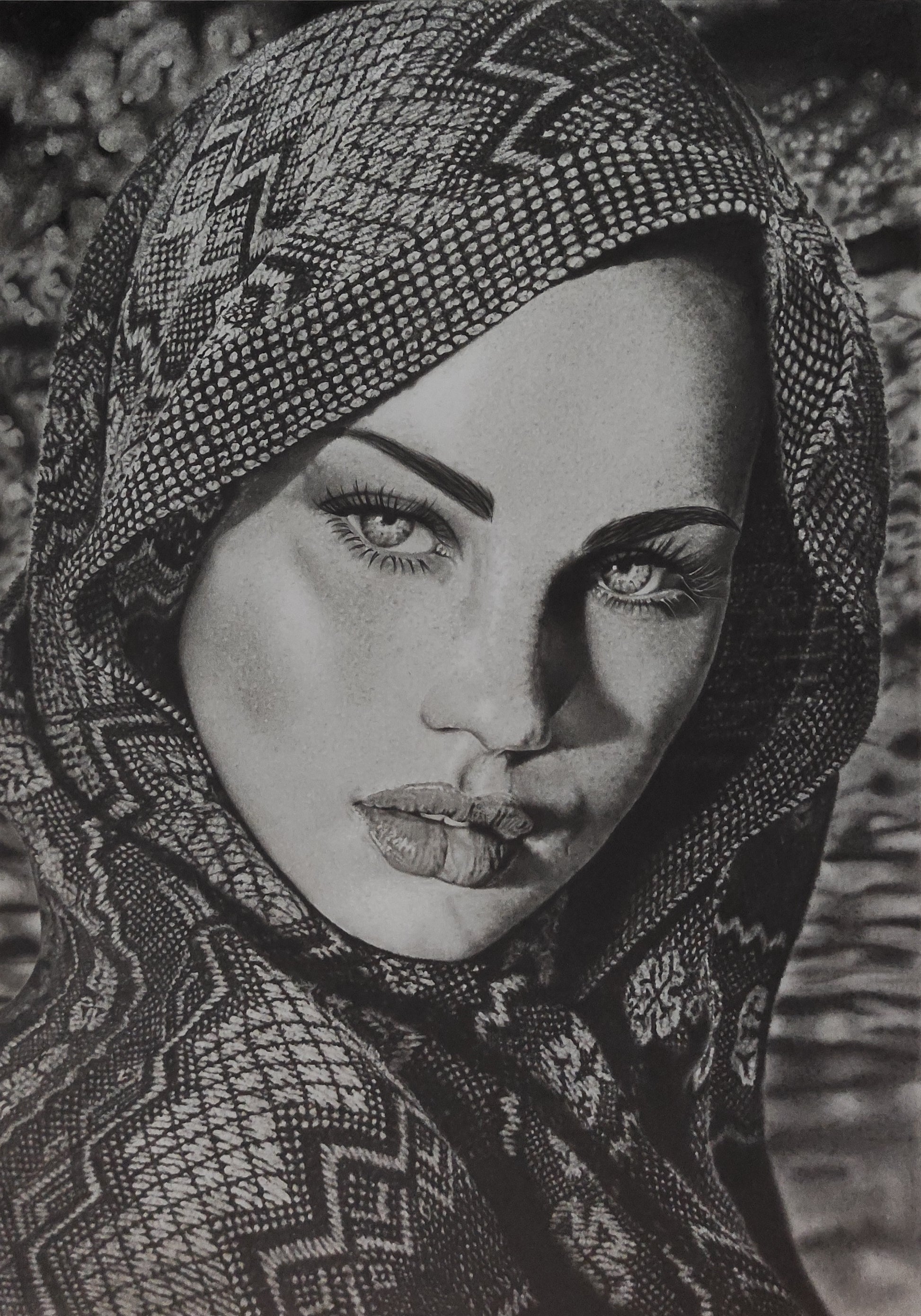 There are works that you look at, and there are works that look back at you. "Arabian" is a piece that captures you from the first moment. It's not a photograph; it's the pulse and patience of more than 70 hours of work Meticulously drawn with graphite pencils, each stroke seeks life within the paper. The intensity of his eyes and the incredible texture of the veil not only demonstrate a hyperrealistic technique, but also tell a story of strength and mystery without the need for words.