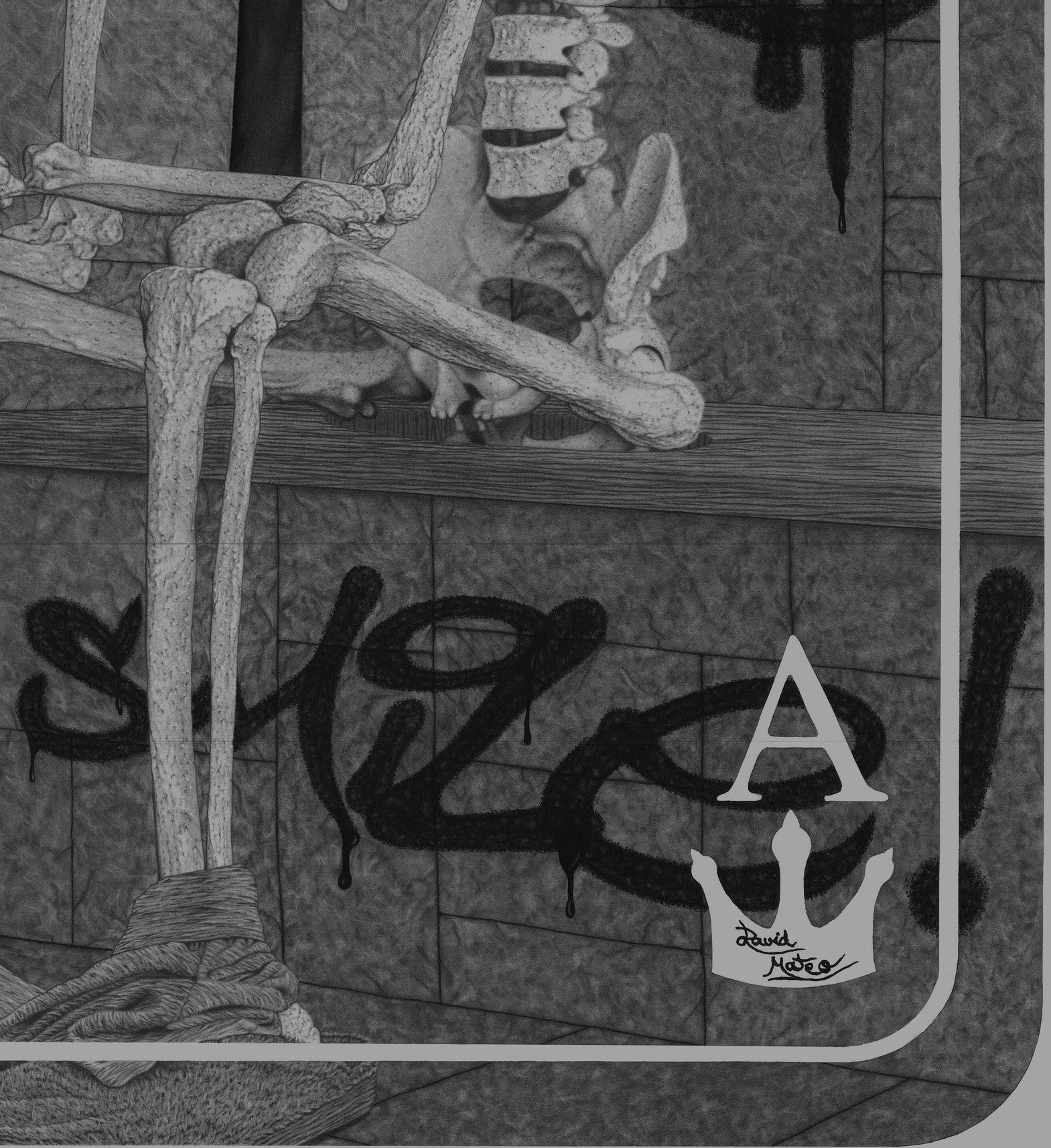 The fruit of 200 hours of obsessive graphite work , every detail of this piece is a commentary. From the crown-emblazoned toilet paper to the "In Case of Assassination, Break the Glass" box—a solution to the uprising that is, ironically, inaccessible—the work is a raw and scathing reflection on power, money, and disconnection.