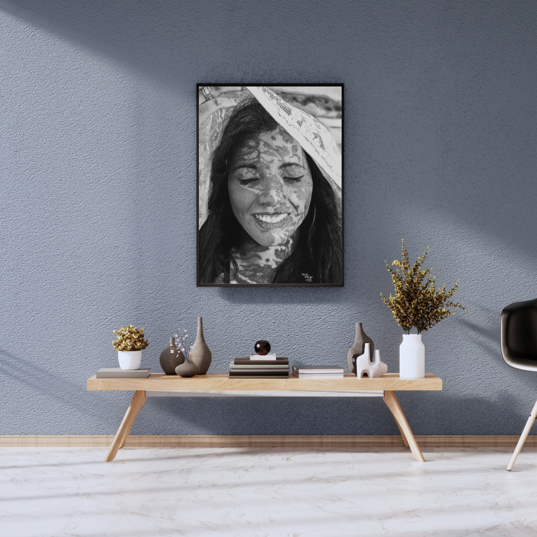 "Bendito Sol" es la captura de uno de esos instantes. Esta lámina de arte reproduce un retrato hiperrealista que irradia serenidad y alegría, un momento íntimo donde la luz del sol se filtra a través de un delicado velo de encaje, dibujando un mapa de sombras sobre un rostro en paz.