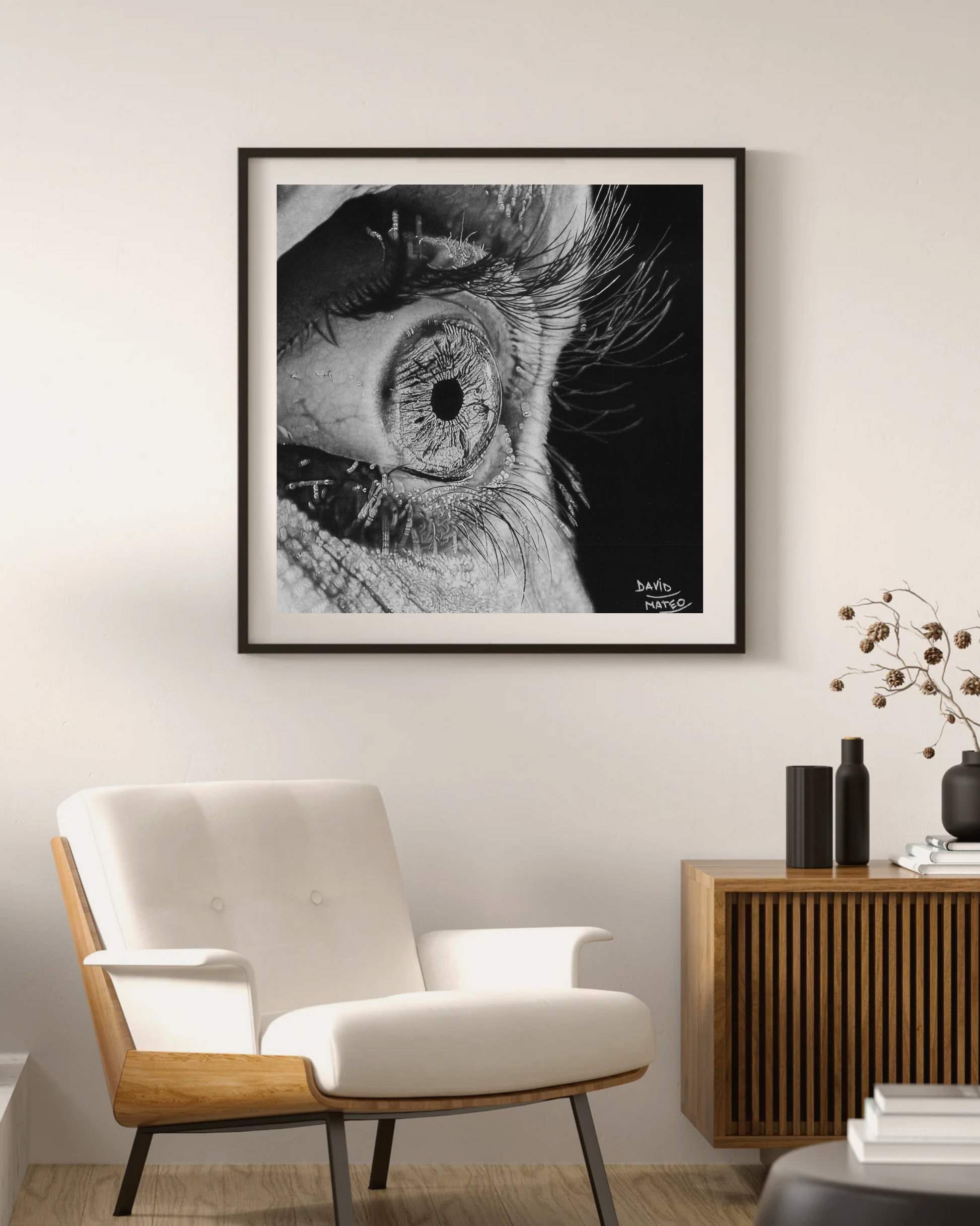 Dicen que los ojos son la ventana del alma. Esta obra no es una ventana, es un universo entero. "Ojo por Ojo" es la reproducción de un dibujo hiperrealista que te sumerge en el microcosmos de un ojo humano, donde cada fibra del iris, cada pestaña y cada reflejo de luz está capturado con una precisión que desafía la realidad.