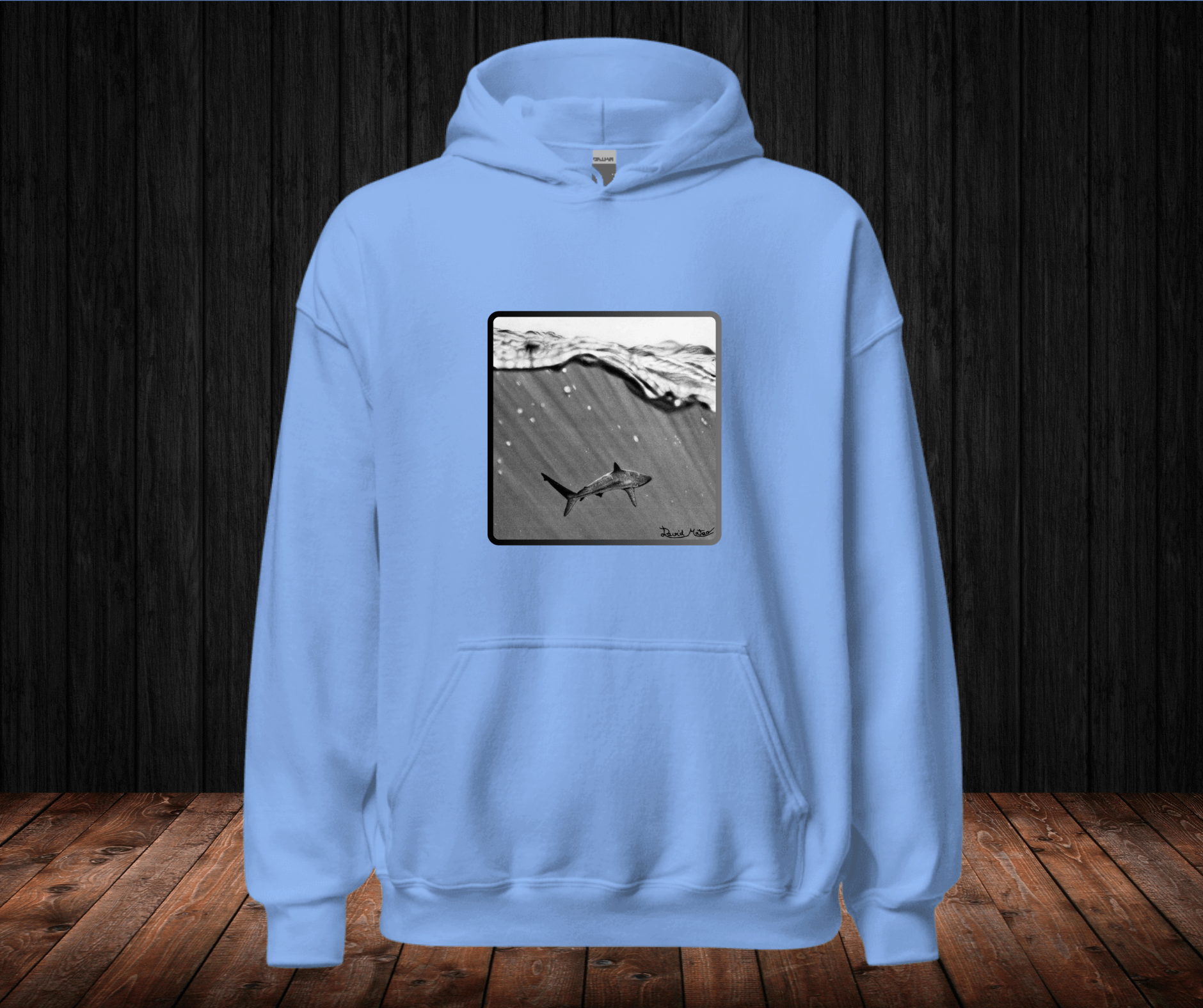 Esta sudadera con capucha presenta un diseño exclusivo basado en el dibujo original “Shark” hecho a mano con carboncillo. Su ilustración hiperrealista del tiburón, nadando bajo la superficie del agua, captura la tensión y serenidad del océano en un contraste de blanco y negro que transmite poder y calma a la vez.