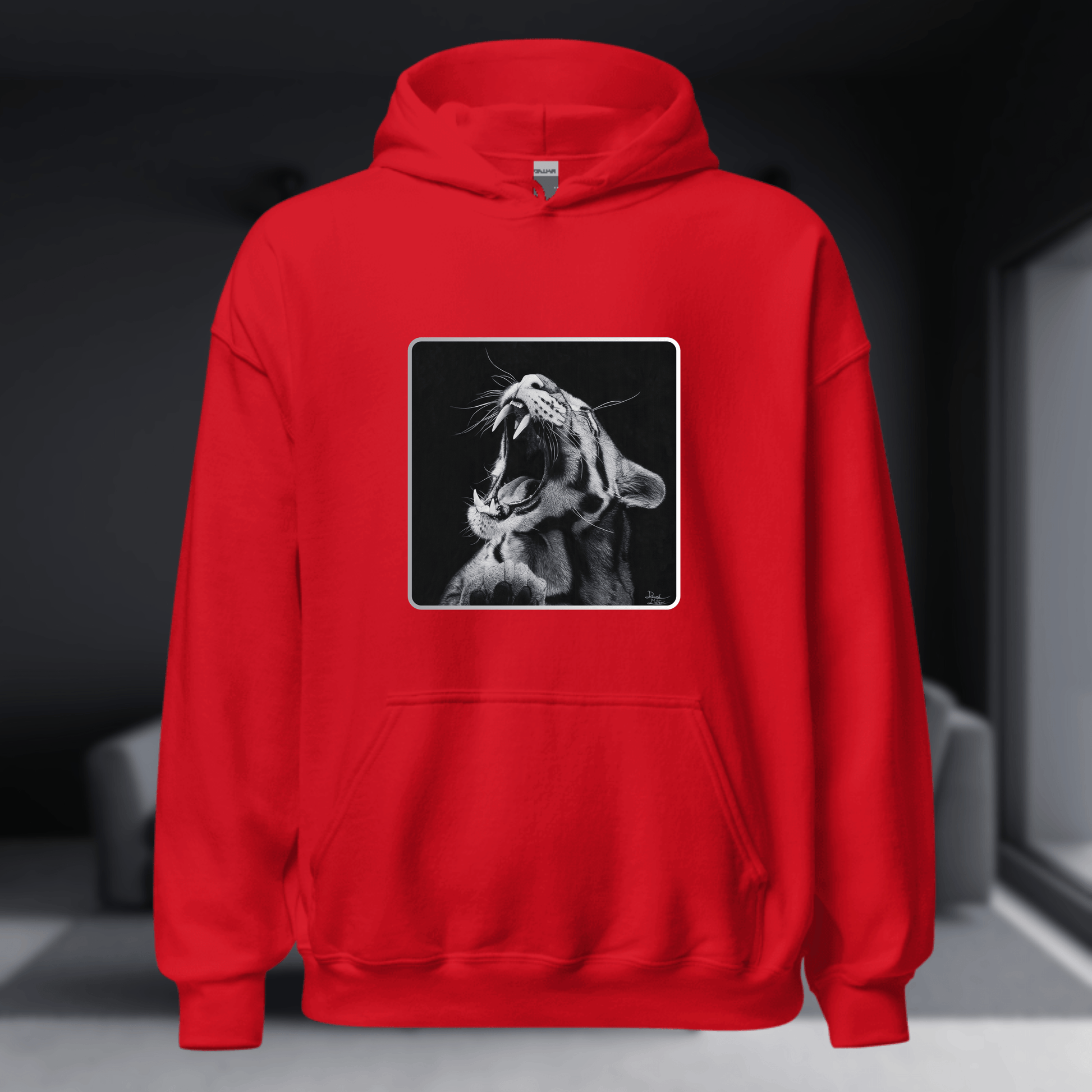 Sudadera con capucha con el diseño en blanco y negro del dibujo hiperrealista "Salvaje" de un tigre rugiendo, por el artista David Mateo.